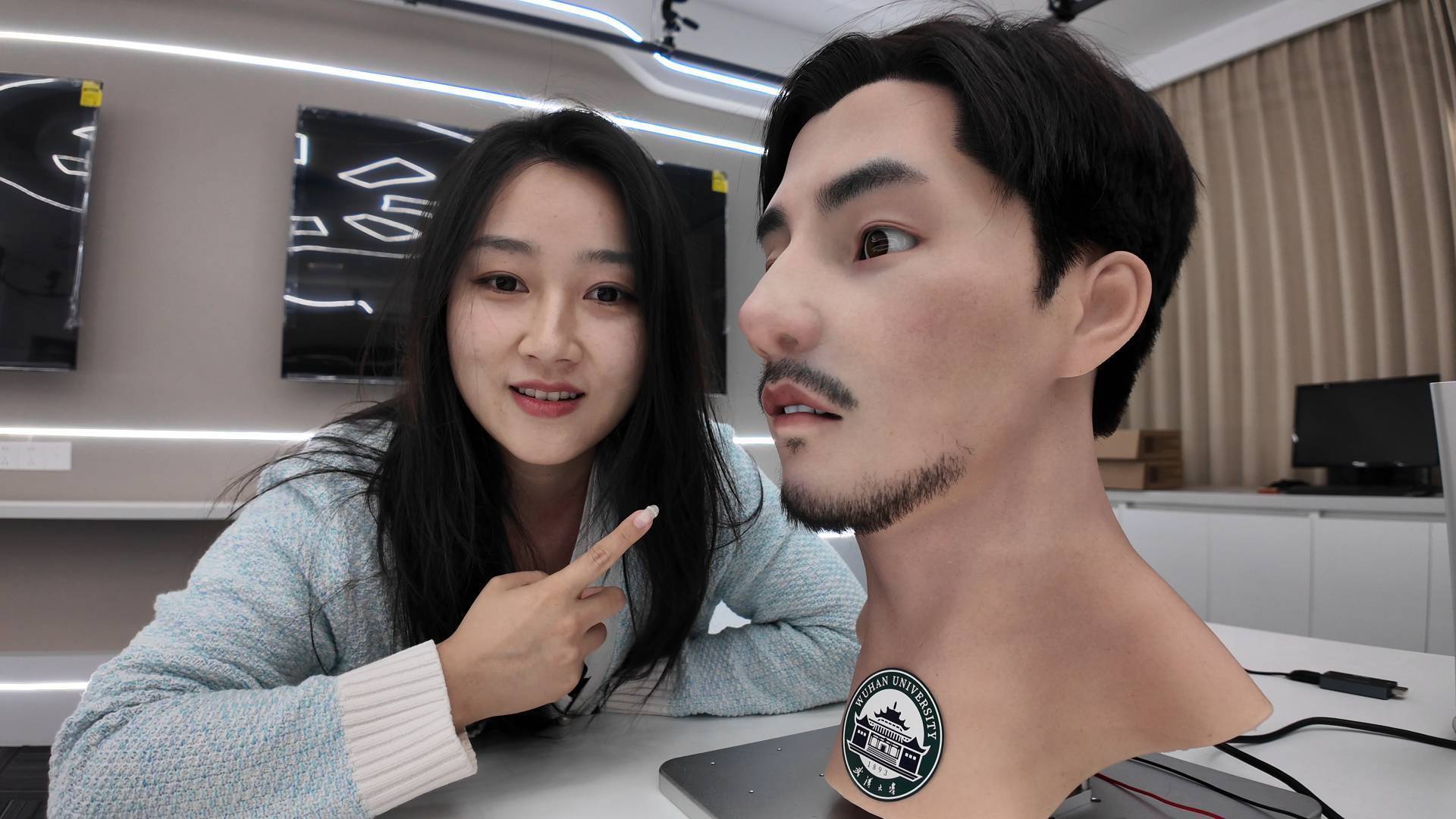 在武汉大学计算机学院的实验室里,一颗机器头正盯着来访者。它的硅胶皮肤下藏着22个电机,眼球转动,眉毛微扬,嘴角扯出一个似笑非笑的弧度。当研究人员说出“轻蔑”一词,它的眼球偏向一侧,飞出一个白眼,嘴角轻轻一撇——这个微妙的表情,和真人的“轻蔑”反应如出一辙。