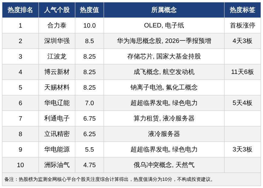 4月28日,A股十大人气热股如下:合力泰、深圳华强、江波龙、博云新材、天赐材料、华电辽能、利通电子、立讯精密、华电能源、洲际油气。