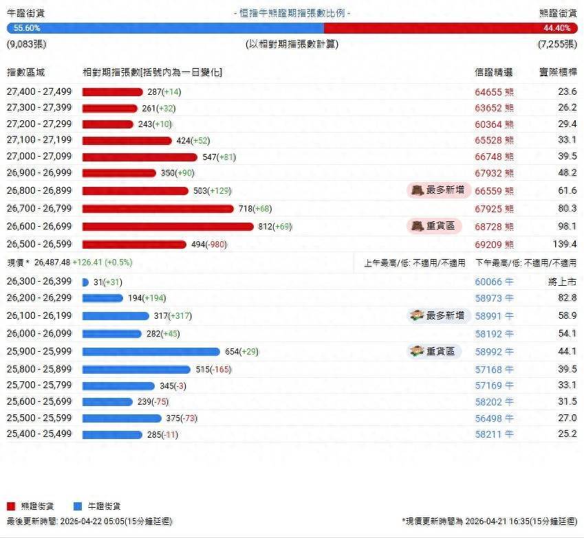 牛证街货重货区在25900-25999区间,该区间最新牛证数量为654张,较上一交易日增加29张;牛证街货最多新增在26100-26199区间,该区间最新牛证数量为317张,较上一交易日增加317张。