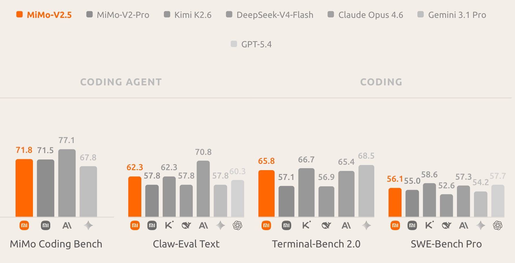 从小米最新公布的测评结果来看,MiMo-V2.5在Claw-Eval Text、Terminal-Bench 2.0、SWE-Bench Pro等多项测评中大幅超越了DeepSeek最新发布的DeepSeek-V4-Flash。