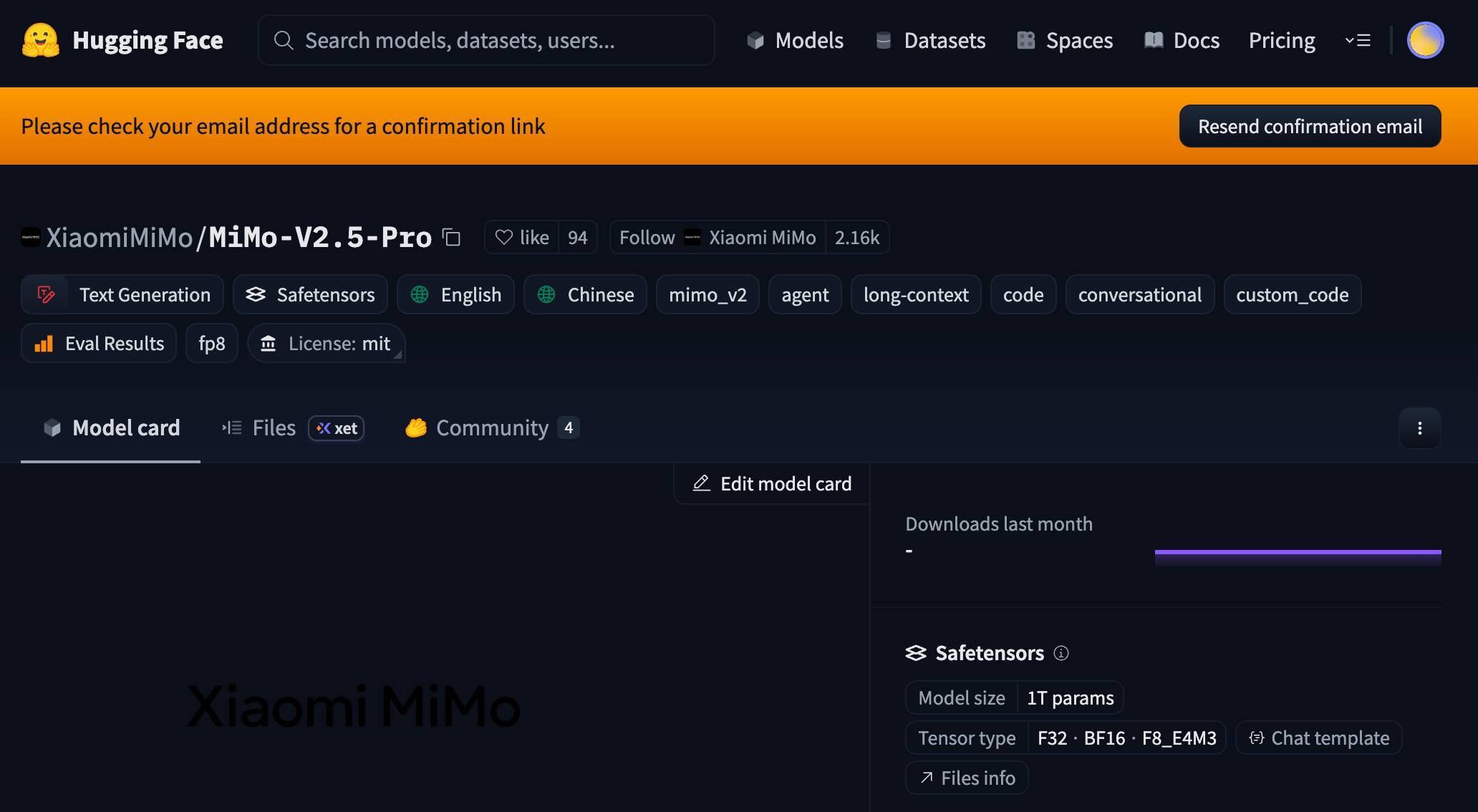 ▲MiMo-V2.5-Pro在Hugging Face的开源页面截图